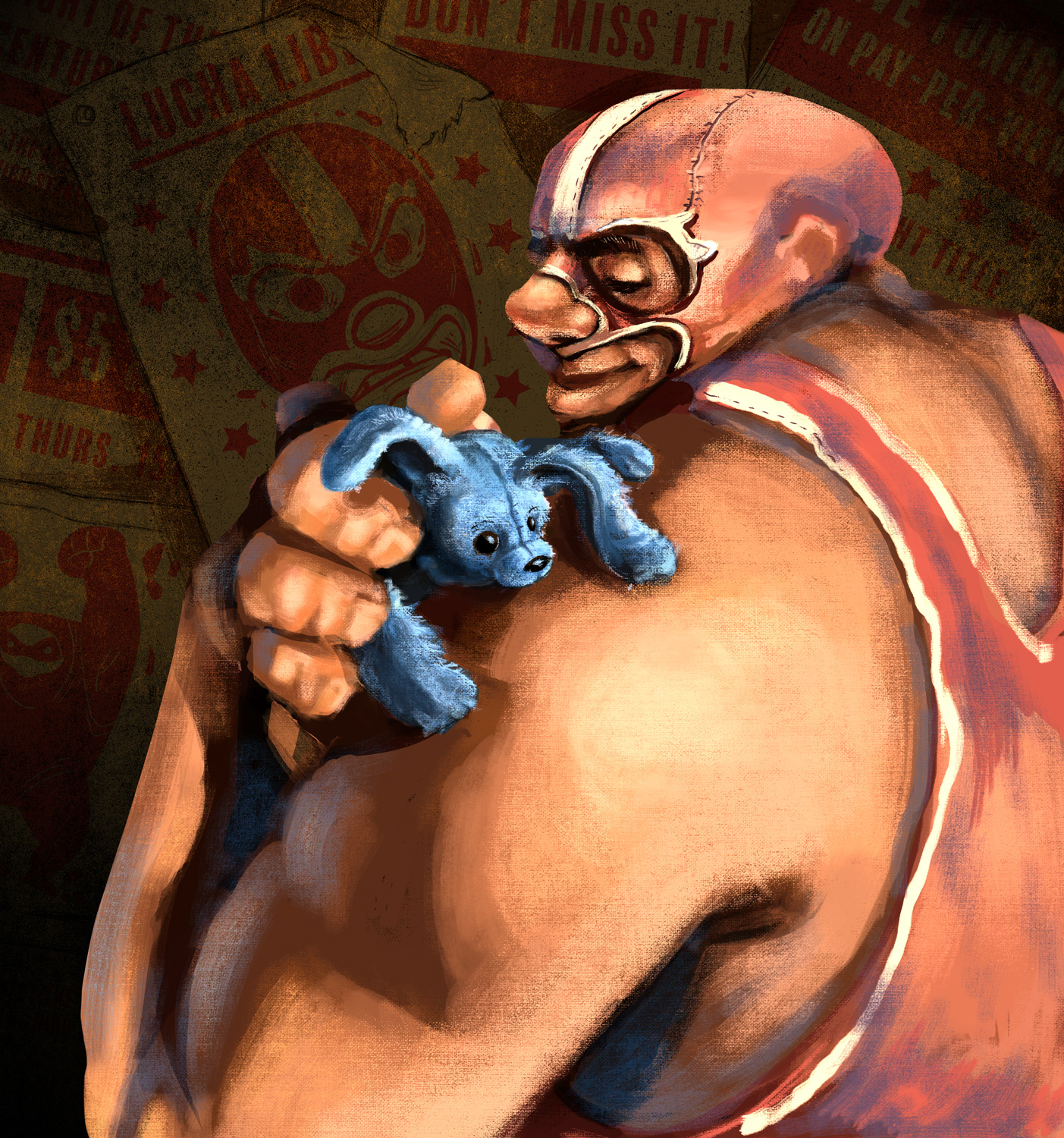 Another installment in my senior thesis show, this luchador piece features a fighter in an atypical moment. The viewer gets to see the soft side of a figure that is normally menacing and feared in the wrestling ring.