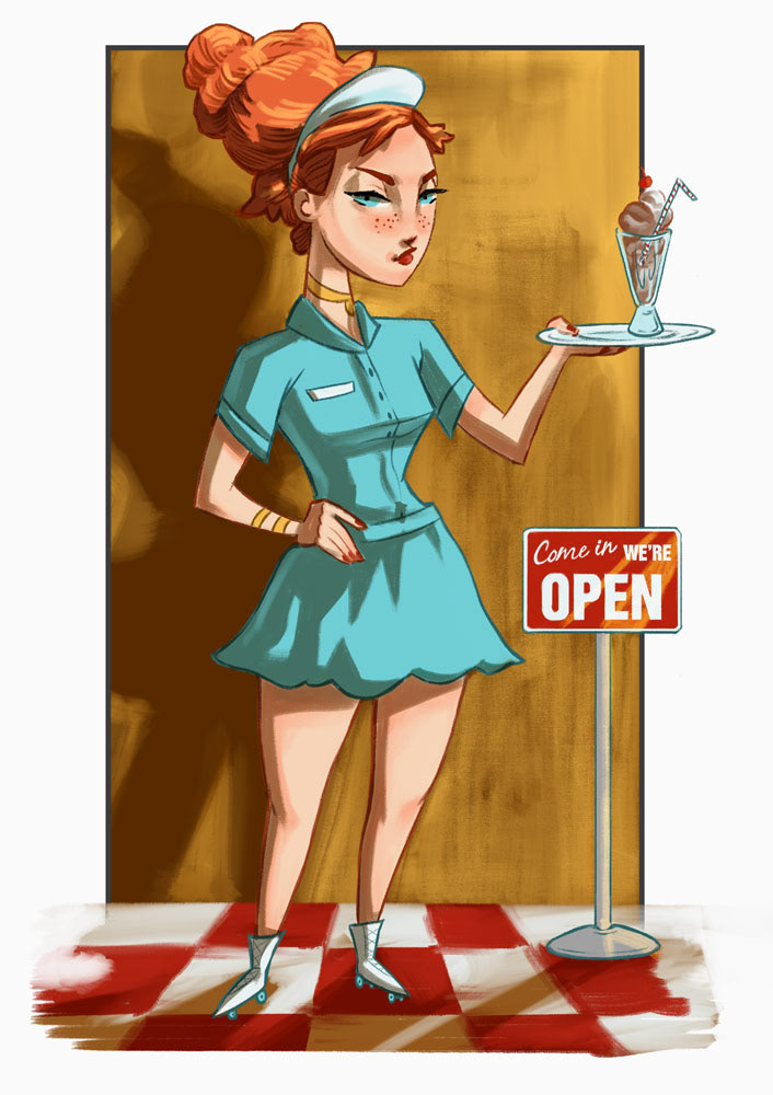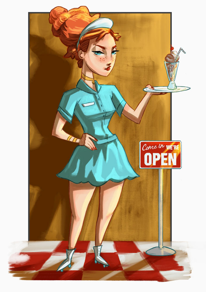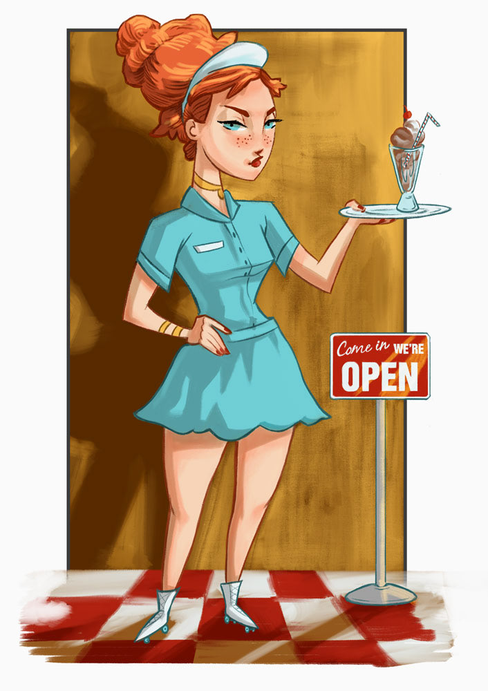 Actualized this rollerblading waitress character for a animated show idea I had that takes place in a 1950's sitcom.